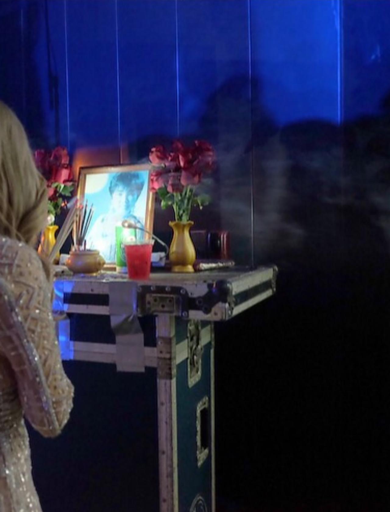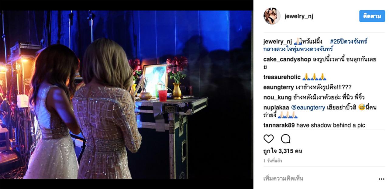 ซึ่งสาว จิ๋ว ได้ลงรูปที่ทั้งคู่กำลังไหว้รูปแม่ผึ้ง พุ่มพวง ดวงจันทร์ อยู่ด้านหลังเวทีก่อนจะขึ้นคอนเสิร์ต และในภาพถ่ายดังกล่าวมีอะไรบางอย่างติดมา