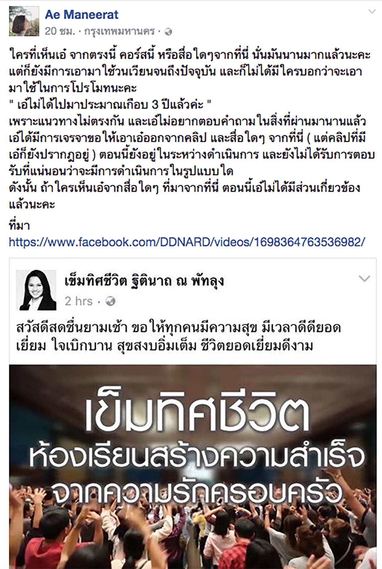 เอ๋ มณีรัตน์ โพสต์เฟซบุ๊กส่วนตัวเดือด พร้อมครอปภาพเพจ เข็มทิศชีวิต ฐิตินาถ ณ พัทลุง ขอให้อีกฝ่ายหยุดนำคลิปที่มีตนไปโปรโมตเสียที โดยเจ้าตัวบอกไม่ได้ไปเรียนมา 3 ปีแล้ว เพราะแนวทางไม่ตรงกัน