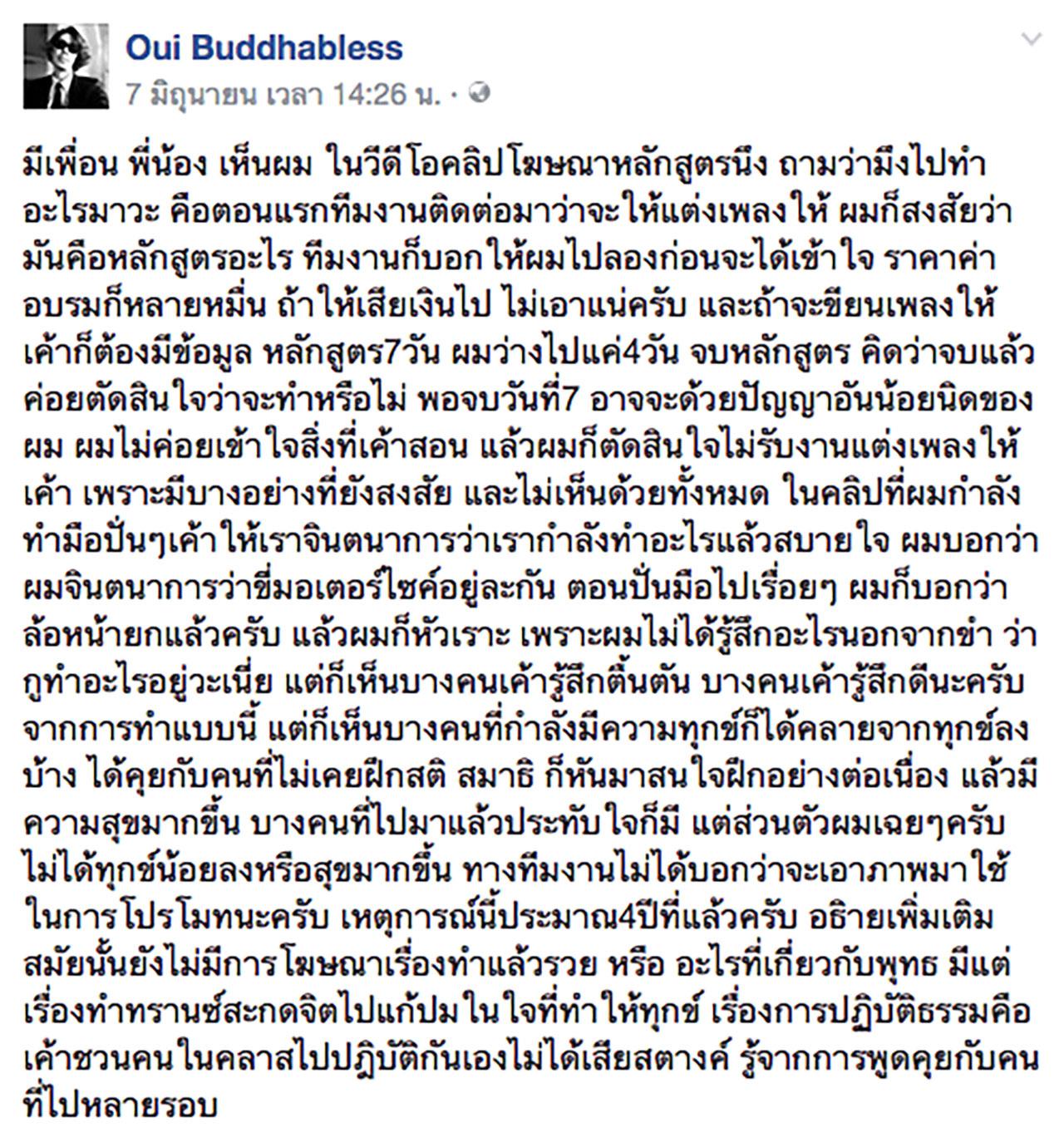 อธิบายเพิ่มเติม สมัยนั้นยังไม่มีการโฆษณาเรื่องทำแล้วรวย หรืออะไรที่เกี่ยวกับพุทธ มีแต่เรื่องทำทรานซ์สะกดจิตไปแก้ปมในใจที่ทำให้ทุกข์ เรื่องการปฏิบัติธรรมคือเขาชวนคนในคลาสไปปฏิบัติกันเองไม่ได้เสียสตางค์ รู้จากการพูดคุยกับคนที่ไปหลายรอบ”