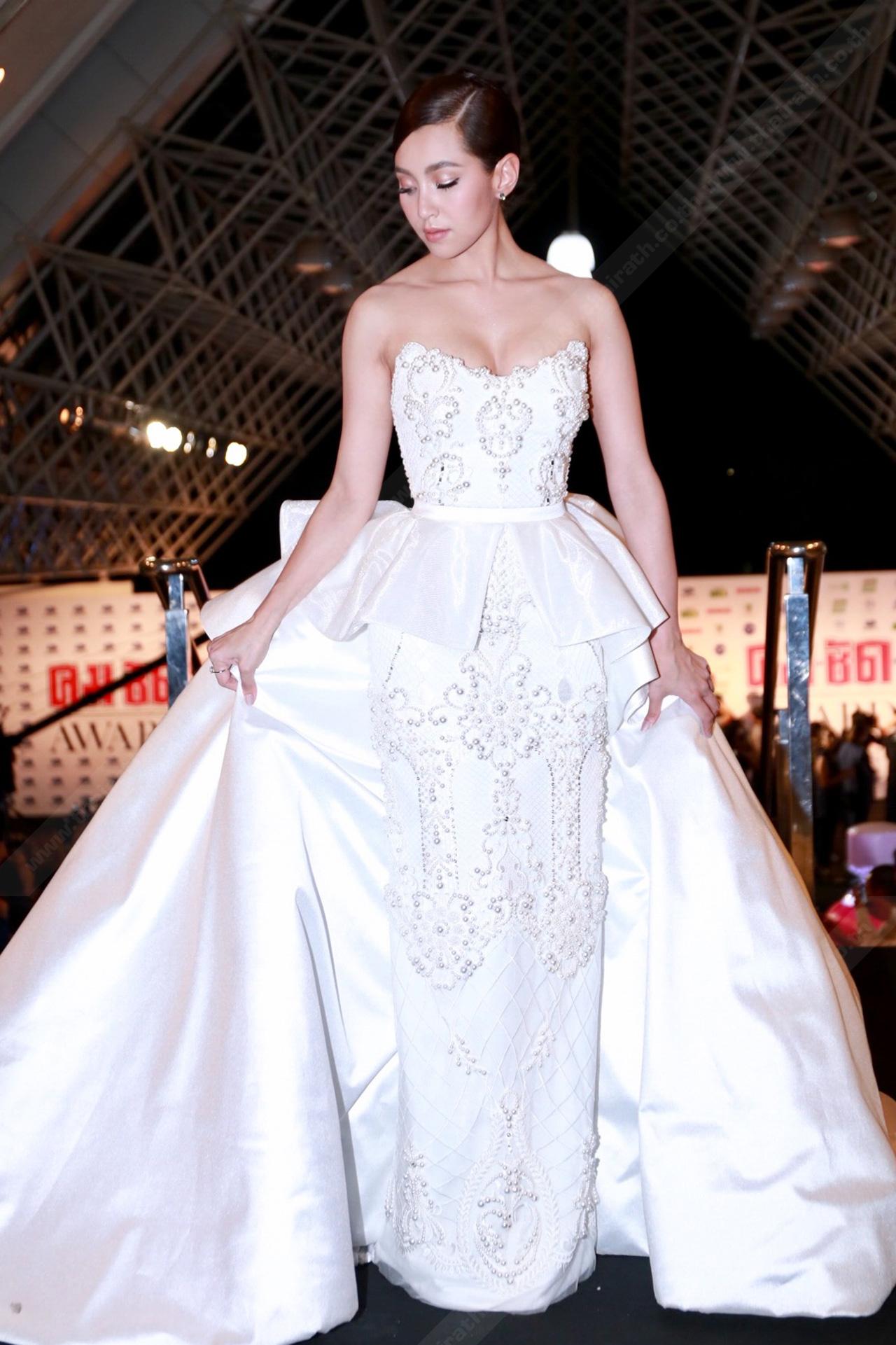 กับชุดราตรีสีขาวหางยาวปักเลื่อม ที่เน้นสัดส่วนชัดเจน