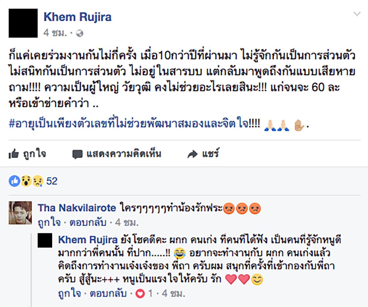 “ก็แค่เคยร่วมงานกันไม่กี่ครั้ง เมื่อ 10 กว่าปีที่ผ่านมา ไม่รู้จักกันเป็นการส่วนตัว ไม่สนิทกันเป็นการส่วนตัว ไม่อยู่ในสารบบ แต่กลับมาพูดถึงกันแบบเสียหาย ถาม!!!! ความเป็นผู้ใหญ่ วัยวุฒิ คงไม่ช่วยอะไรเลยสินะ!!! แก่จนจะ 60 ละ หรือเข้าข่ายคำว่า ..