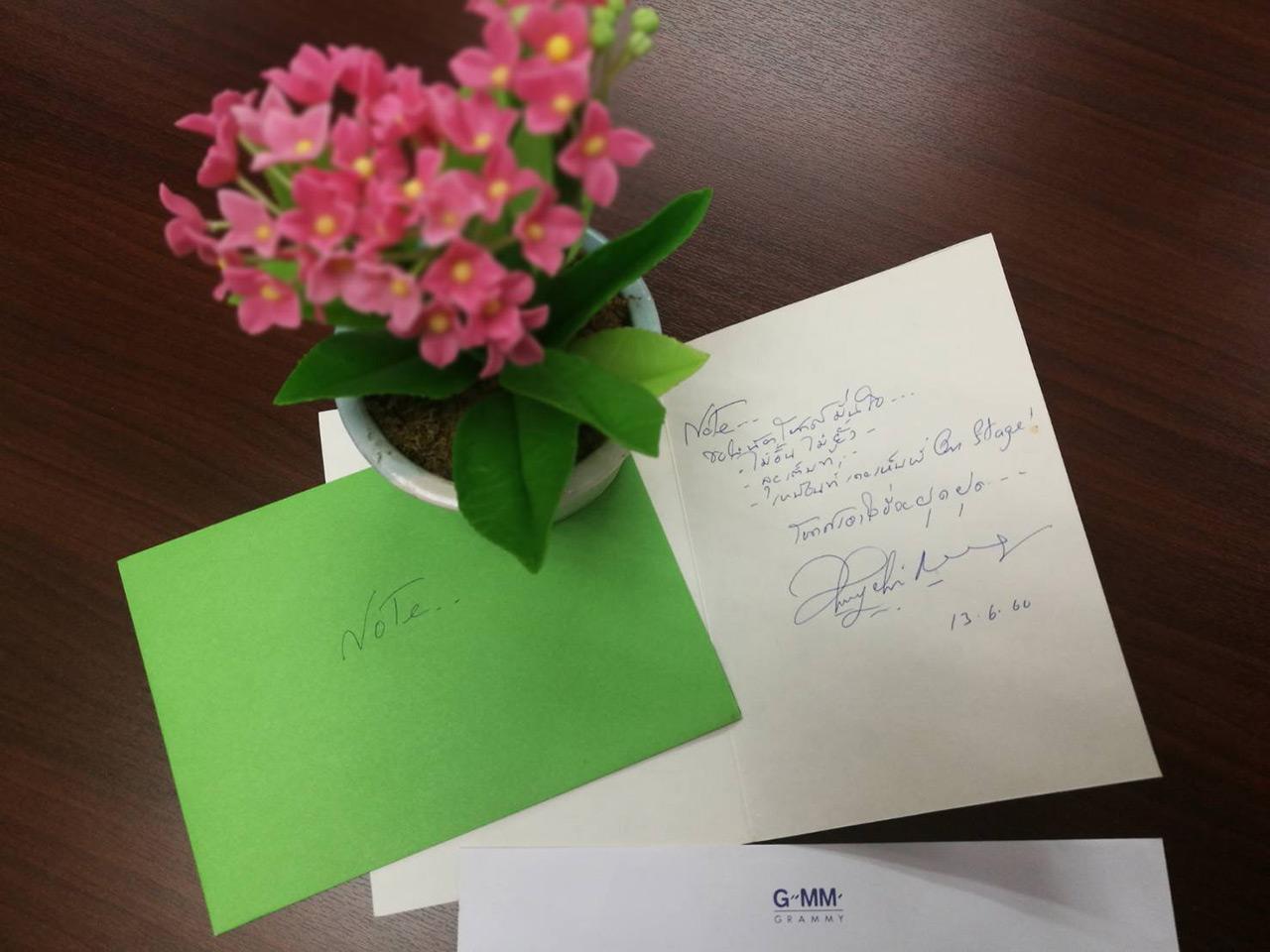 โดยพี่เบิร์ดเขียนข้อความมาในการ์ดว่า “Note...ขอให้โน้ตมั่นใจ ไม่อั้น ไม่ยั้ง ลุยเต็มที่ เหมือนที่เคยเห็นพี่ On Stage โชคดี เอาใจช่วย ฝุดๆ”