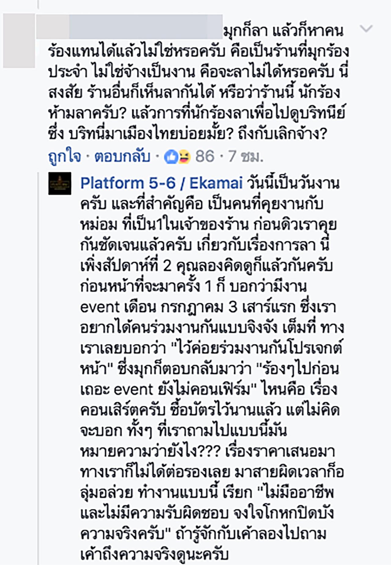 แต่ก็ยังมีอีกฝ่ายมาแสดงความเห็นว่า มุก เป็นนักร้องประจำของร้าน ไม่ใช่งานจ้างสามารถลาได้ ซึ่งทางร้านก็ชี้แจงว่างานนี้มีการแจ้งกันไว้นานแล้ว