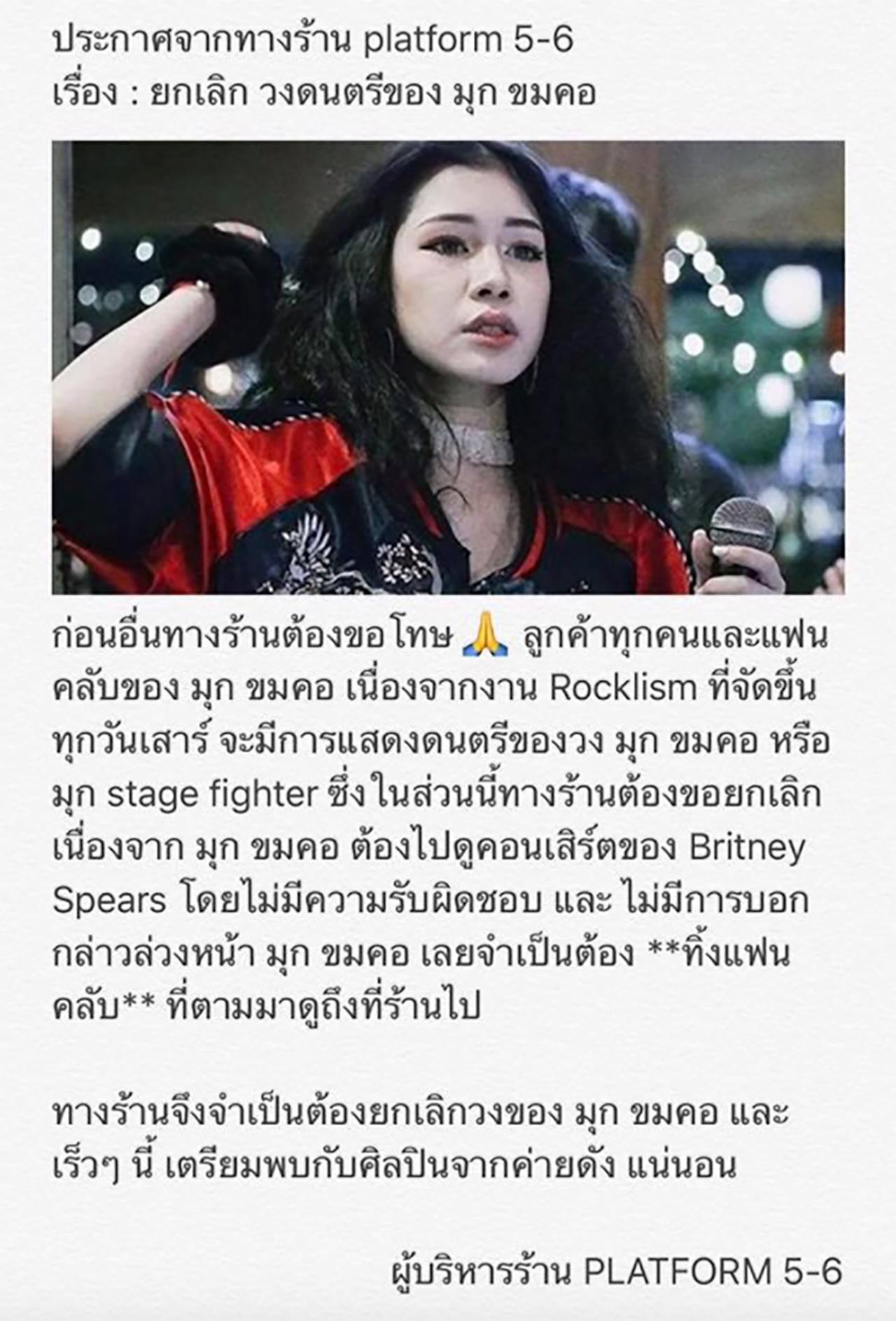 ทางร้านจึงจำเป็นต้องยกเลิกวงของ มุก ขมคอ และเร็วๆ นี้เตรียมพบกับศิลปินจากค่ายดังแน่นอน