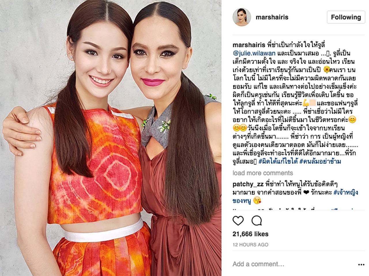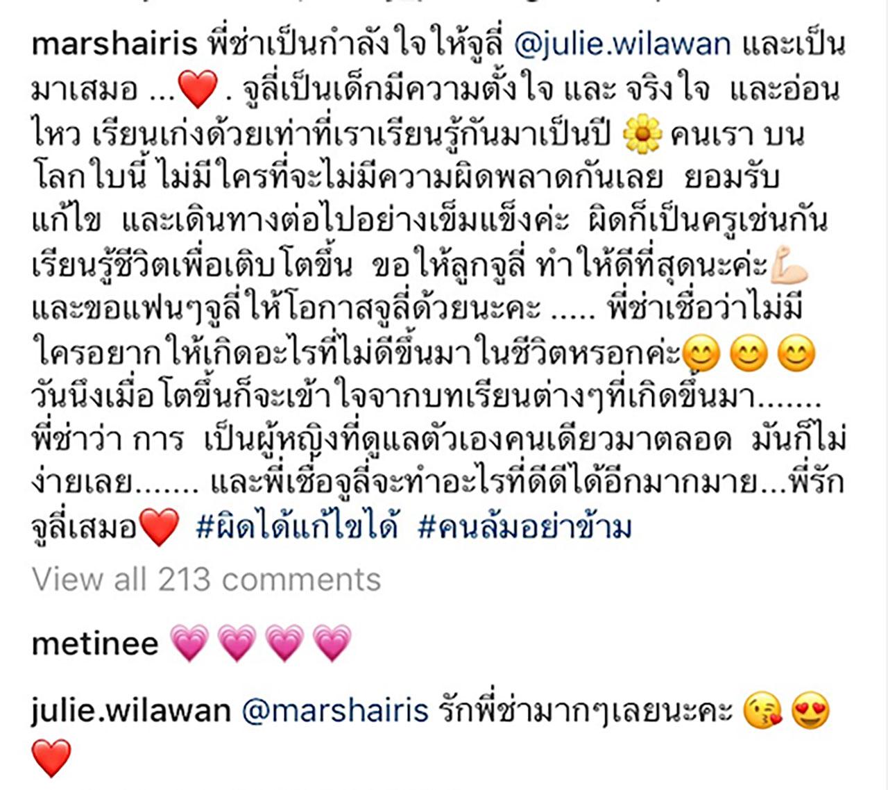 “พี่ช่าเป็นกำลังใจให้จูลี่ @julie.wilawan และเป็นมาเสมอ .... จูลี่เป็นเด็กมีความตั้งใจ จริงใจ และอ่อนไหว เรียนเก่งด้วยเท่าที่เราเรียนรู้กันมาเป็นปี คนเราบนโลกใบนี้ ไม่มีใครที่จะไม่มีความผิดพลาดกันเลย ยอมรับ แก้ไข และเดินทางต่อไปอย่างเข็มแข็งค่ะ