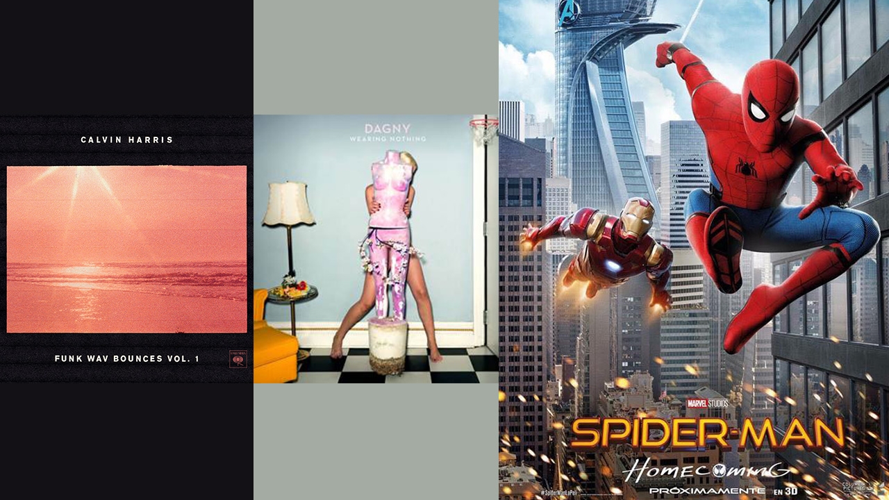 ศุกร์แรกของครึ่งปีหลัง เปิดด้วยซิงเกิ้ลของเซียที่ สไปเดอร์-แมน ภาคล่าสุด หนังซุปเปอร์ฮีโร่วัยใสของซัมเมอร์นี้นำมาใช้ ส่วนใครยังไม่ได้สัมผัสความรู้สึกหลากหลายของ คาลวิน ฮาร์ริส รีบคลิกด่วน และพาสาวนอร์เวย์ แดกนี มาแนะนำตัวพร้อมซิงเกิ้ลใหม่ล่าสุด