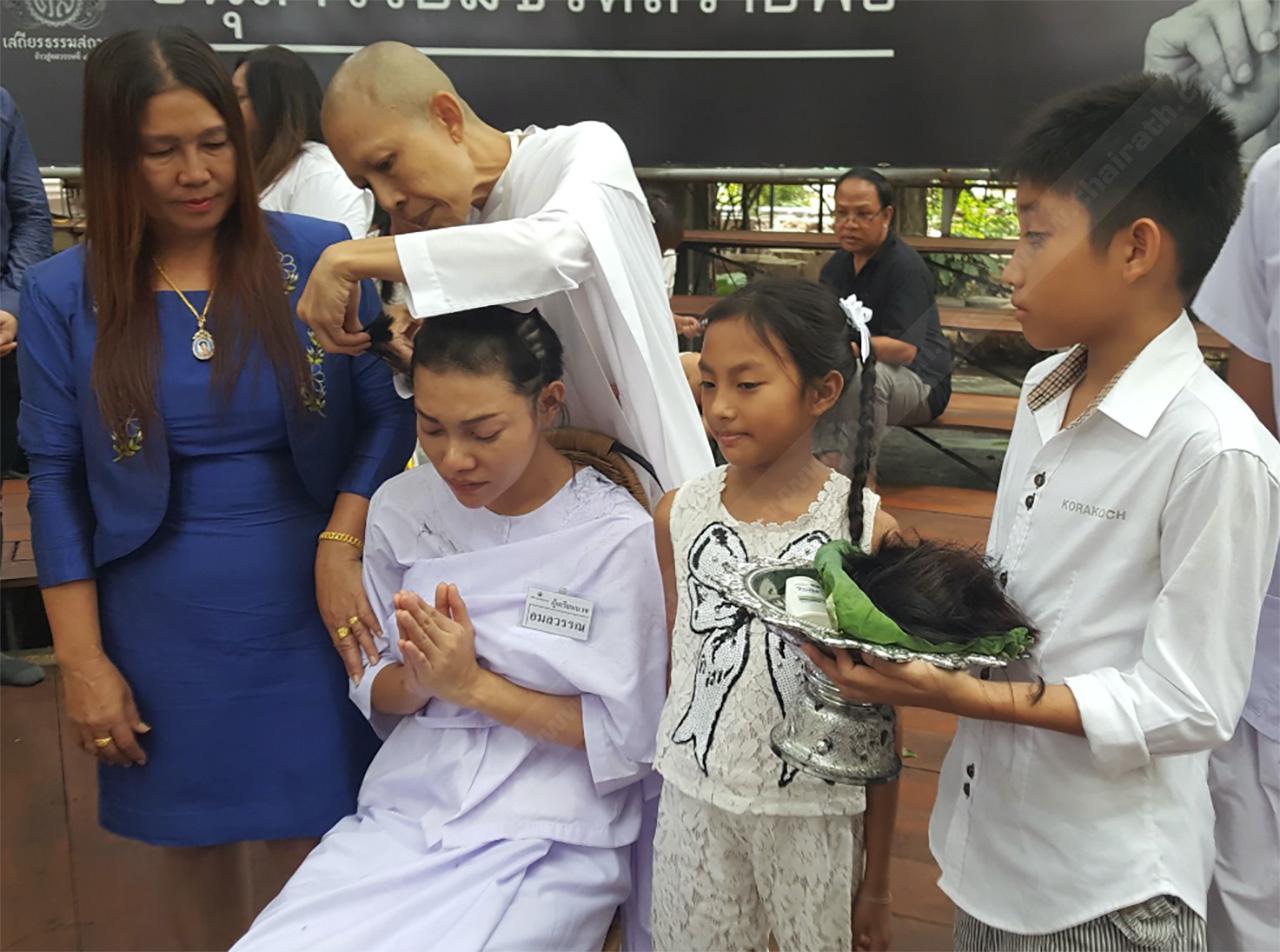 โดยในมีพิธีกริบผมนั้น เอมมี่ หลังน้ำตาร้องไห้ตลอดเวลา ซึ่งเจ้าตัวเผยว่าตัดสินใจบวชเพราะอยากแสดงความกตัญญกตเวทีต่อบุพการีและทำความดีเป็นตัวอย่างให้ลูกทั้งสองเห็น