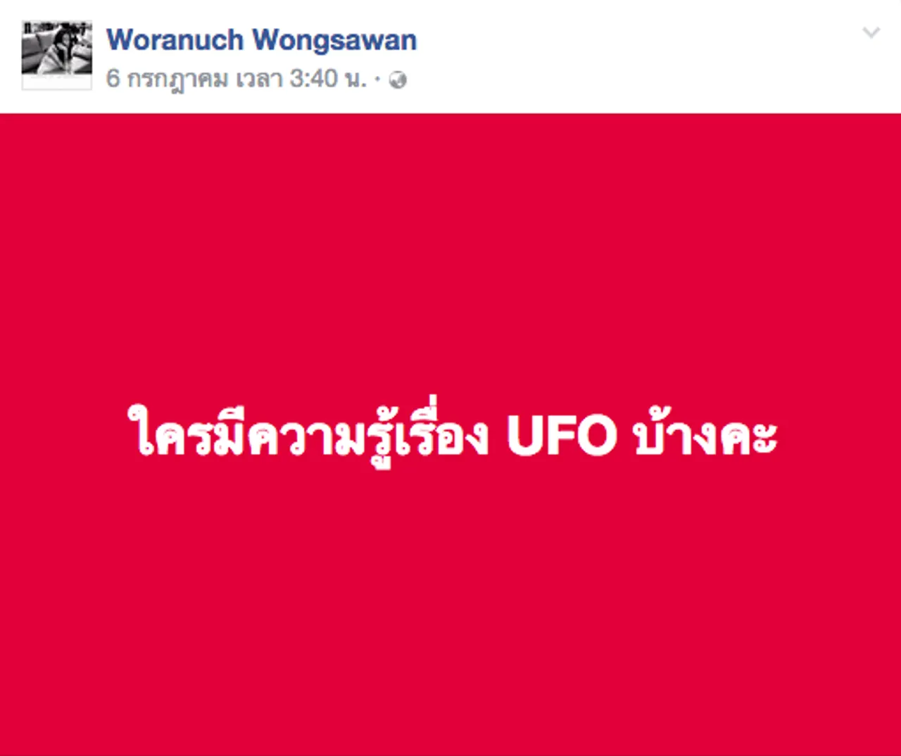 หลังจากที่นางเอกสาว นุ่น วรนุช เจอกลุ่มแสงไฟบนท้องฟ้าที่ประเทศฝรั่งเศส และถ่ายภาพเก็บเอาไว้เพราะคาดว่าสิ่งที่ได้เห็นน่าจะเป็นจานบิน หลังจากนั้นเจ้าตัวก็ได้โพสต์ข้อความถามว่าในเฟซบุ๊กว่า “ใครมีความรู้เรื่อง UFO บ้างคะ”