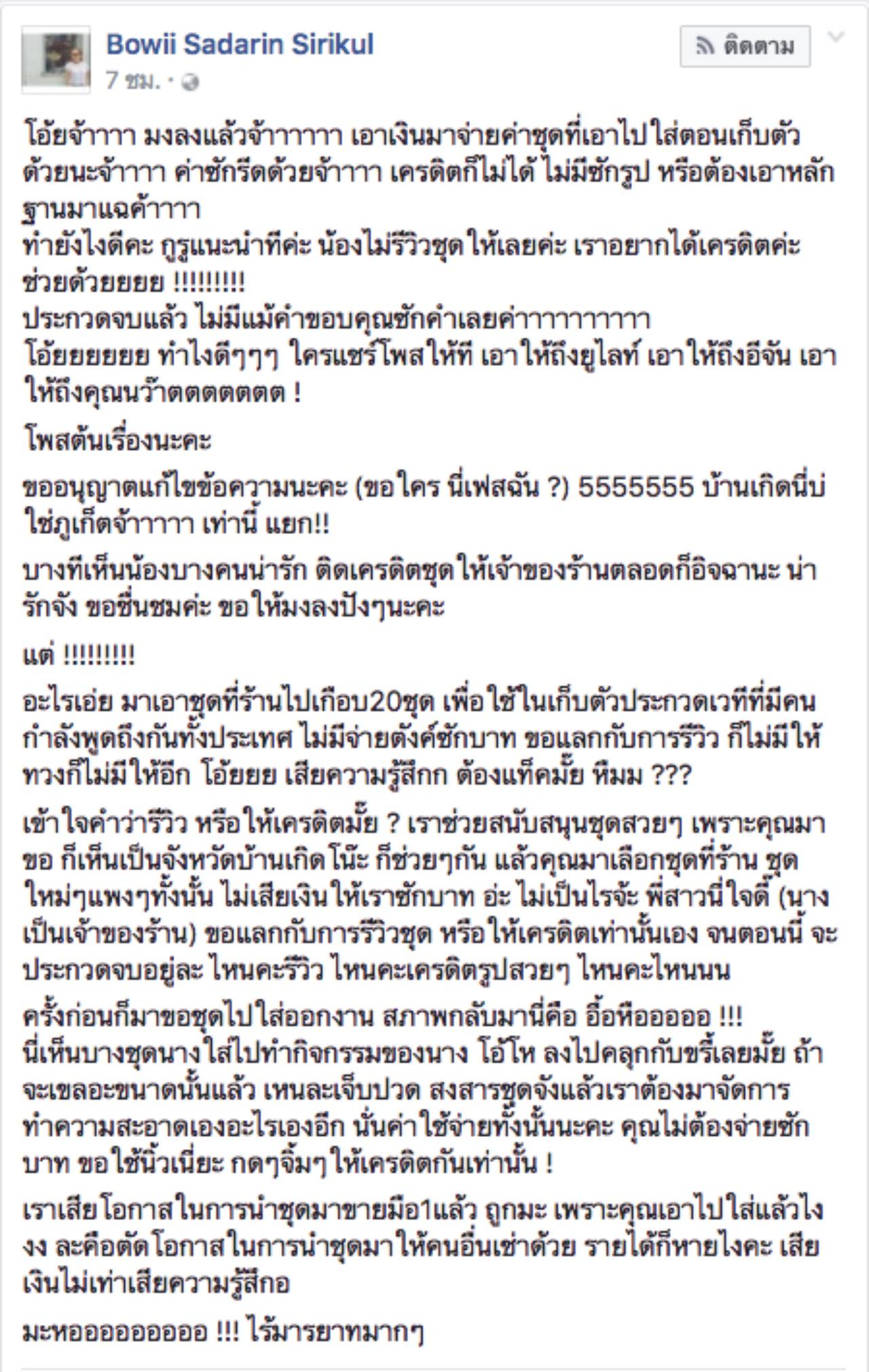 "โอ๊ยจ้าาาา มงลงแล้วจ้าาาาาา เอาเงินมาจ่ายค่าชุดที่เอาไปใส่ตอนเก็บตัวด้วยนะจ้าาาา ค่าซักรีดด้วยจ้าาาา เครดิตก็ไม่ได้ ไม่มีซักรูป หรือต้องเอาหลักฐานมาแฉค้าาาา
