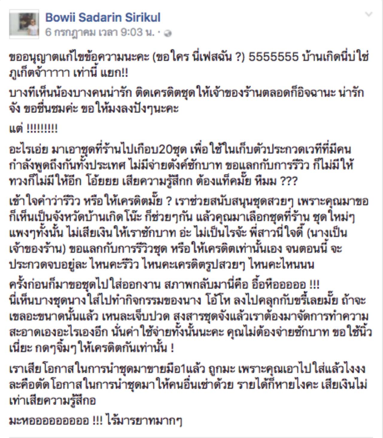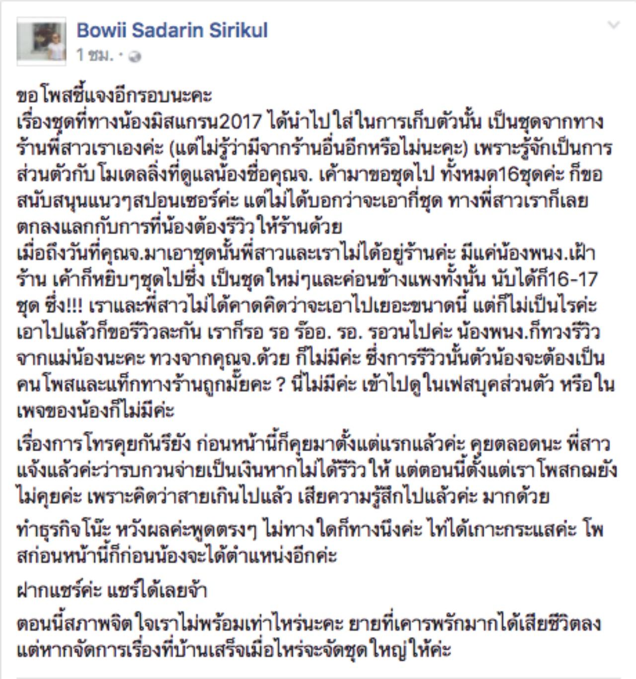 แต่ได้ตำแหน่งยังไม่ทันข้ามวันเลย ล่าสุดสาวแพมก็เจอแฉซะงั้น มีผู้ใช้เฟซบุ๊กชื่อ Bowii Sadarin Sirikul ได้ออกมาโพสต์ข้อความในทำนองว่า มีผู้เข้าประกวดมิสแกรนด์มาเอาชุดที่ร้านไป 20 กว่าตัว เพื่อใช้ใส่ในการเก็บตัว แต่ไม่ได้จ่ายตังค์สักกะบาท ทางร้านจึงได้ขอแลกกับรีวิวชุดให้ แต่ประกวดใกล้จะจบแล้ว ยังไม่เห็นรูปที่ใส่ชุดของทางร้านและลงรีวิวให้สักภาพ และบางครั้งชุดที่ยืมไป พอเอากลับมา ก็อยู่ในสภาพที่สกปรก ทางร้านต้องมาทำความสะอาดเอง โดยที่อีกฝ่ายไม่ได้จ่ายค่าเสียหายอะไรให้เลย