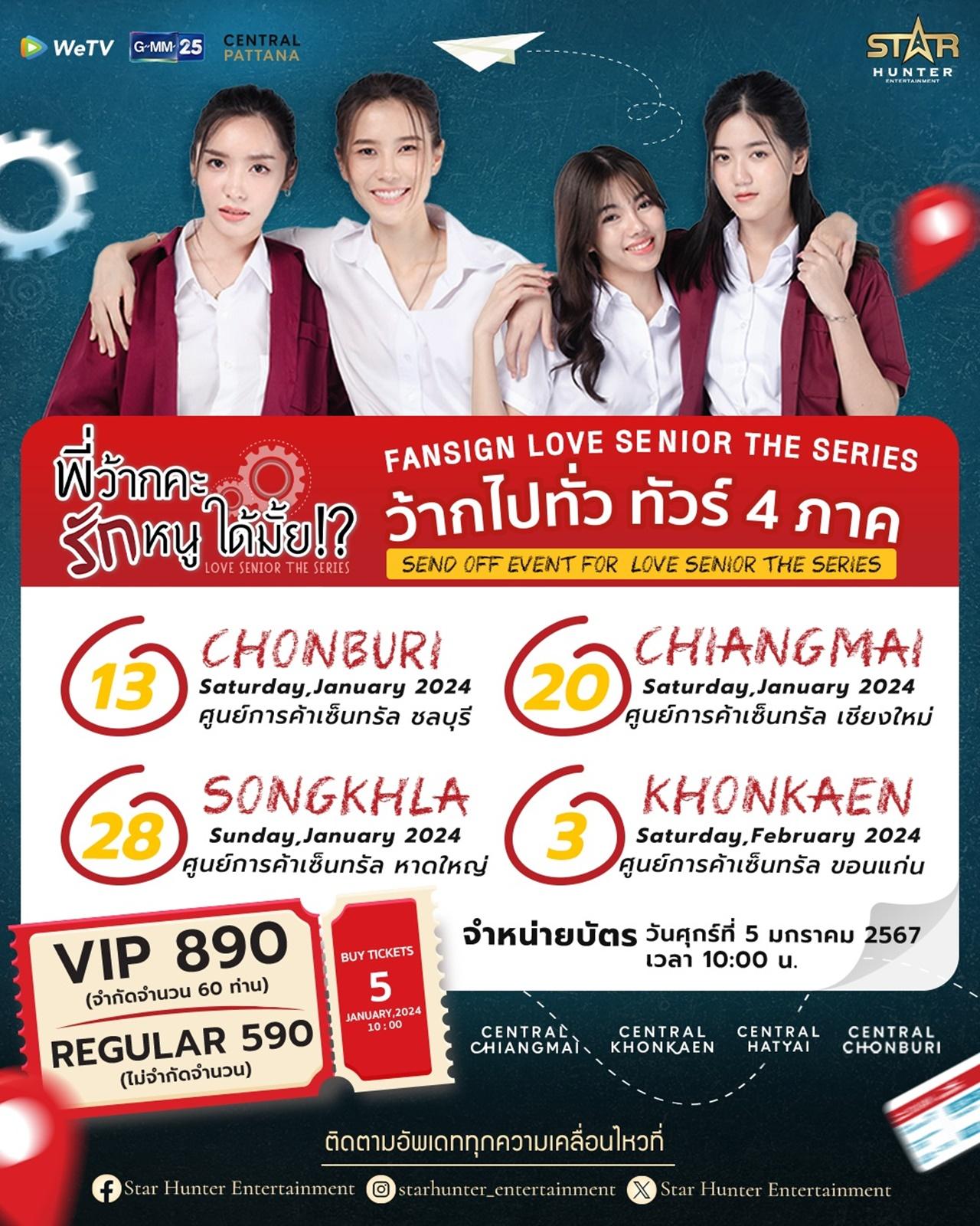 ทุบสถิติเทรนด์ทวิตเตอร์ (X) ดัน #LoveseniorEP9 ครองอันดับ 1 สำเร็จ และยังติดเทรนด์โลก อันดับที่ 14 อีกด้วย สำหรับซีรีส์ Girl’s Love “พี่ว้ากคะ รักหนูได้มั้ย!?” (LOVE SENIOR THE SERIES) โดยมีคิวลาจอในวันพุธที่ 10 มกราคม 2567 เรียกว่าเข้มข้นจนหยดสุดท้าย ทางค่าย STAR HUNTER ENTERTAINMENT จึงจัดงาน LOVE SENIOR WATCH PARTY เพื่อให้เหล่าแฟนคลับ “พี่ว้ากคะฯ” ได้ร่วมชมตอนจบก่อนใคร ณ โรงภาพยนตร์ พารากอน ซีนีเพล็กซ์ ที่งานนี้เปิดขายไม่ถึง 2 ชั่วโมง บัตรก็ SOLD OUT แรงเกินต้าน! ทำให้เกิดโปรเจกต์ FANSIGN LOVE SENIOR THE SERIES : ว้ากไปทั่ว ทัวร์ 4 ภาค เอาใจแฟนคลับต่างจังหวัด พร้อมเปิดขายบัตรวันแรก ศุกร์ที่ 5 มกราคม 2567