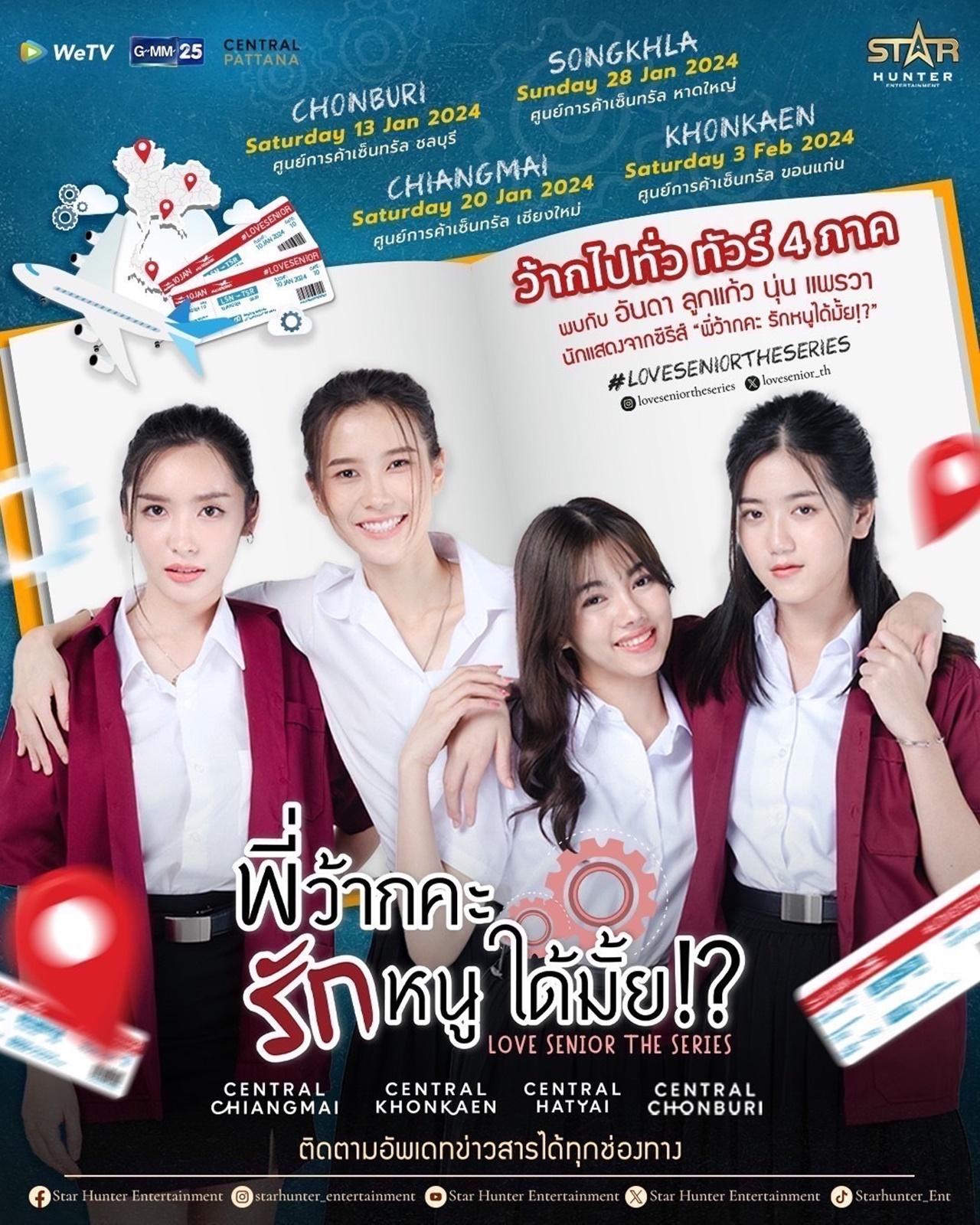 พลาดงานนี้! ถือว่าอด! กับความพิเศษที่คุณจะได้ร่วมเก็บโมเมนต์ความประทับใจ พร้อมกระทบไหล่ 4 นักแสดงนำ กับสองสาวคู่จิ้นเคมีสุดคิวต์ อันดา อนันตา เตียวิรัตน์ และ ลูกแก้ว กมลลักษณ์ แสงทรัพย์สิน ซึ่งเป็นคู่หลักของเรื่อง พร้อมด้วย นุ่น ธัญญพัทธ์ อินยาวิเลิศ และ แพรวา พุทธิชา บุญมาศ คู่รองของเรื่อง “พี่ว้ากคะ รักหนูได้มั้ย!?” (LOVE SENIOR THE SERIES) ที่จะไปร่วมงาน FANSIGN LOVE SENIOR THE SERIES : ว้ากไปทั่ว ทัวร์ 4 ภาค เสิร์ฟความฟินกันถึงที่ ตามตารางดังนี้