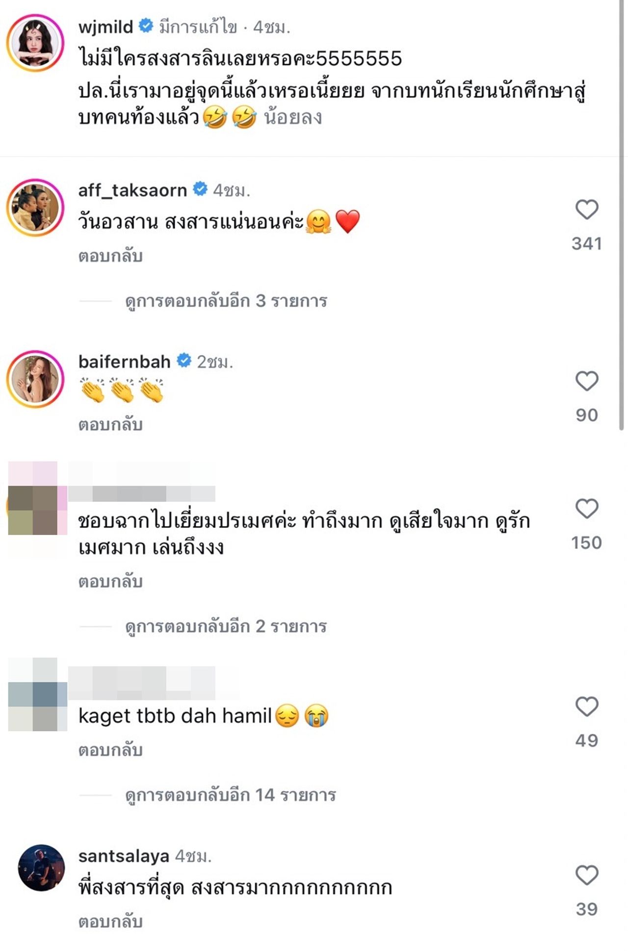 งานนี้ แอฟ ทักษอร ถึงกับรีบคอมเมนต์ว่า “วันอวสาน สงสารแน่นอนค่ะ” ในขณะที่ สันต์ ศรีแก้วหล่อ ผู้กำกับละคร ก็แซวว่า “พี่สงสารที่สุด สงสารมากกกกกกกกกก” นอกจากนี้ก็มีแฟนๆ เข้ามาแซว อาทิ แวบแรกตกใจเลย เพิ่งประกาศแต่งงาน ตัดภาพมา... อ่อ ถ่ายละคร, สงสารอยู่นะคะแต่ก็ไม่ สะใจดี, สงสารแวบเดียว แล้วไปสะใจต่อ55555 ฯลฯ.