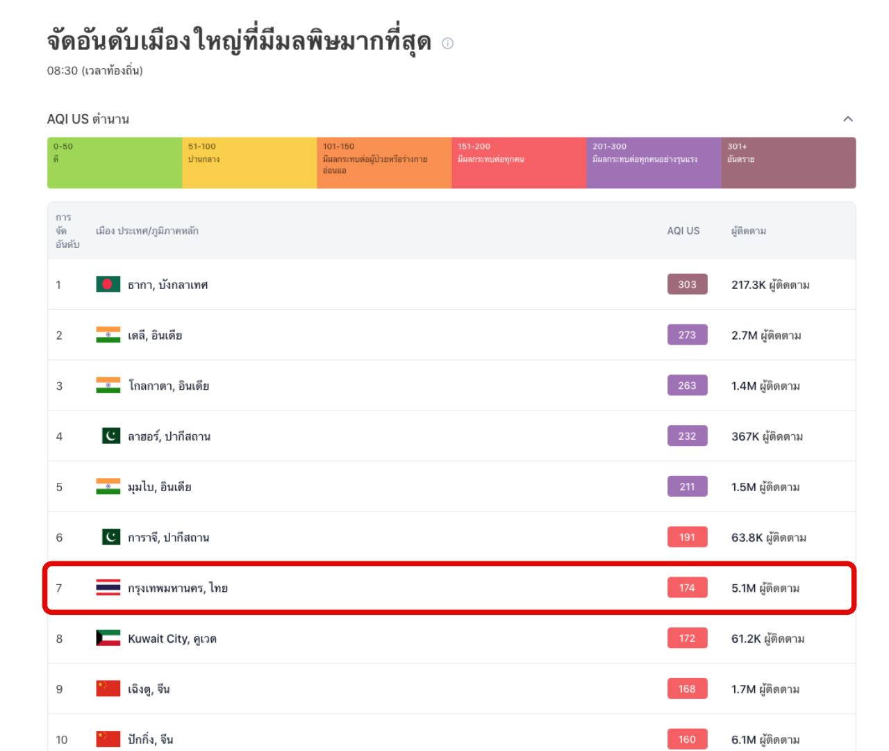 โดยในเวลา 08.30 น. พบว่า กรุงเทพมหานคร ประเทศไทย อยู่อันดับที่ 7 ของเมืองใหญ่ที่มีมลพิษมากที่สุด วัดได้ 174 AQI US ซึ่งเป็นระดับคุณภาพอากาศที่มีผลกระทบต่อทุกคน นอกจากนี้ยังพบว่า เชียงใหม่ อยู่ในอันดับที่ 20 วัดได้ 116 AQI US มีผลกระทบต่อผู้ป่วยหรือร่างกายอ่อนแอ
