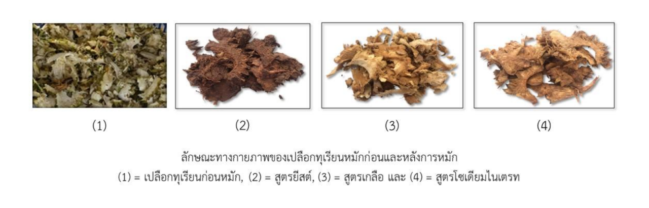 จากนั้นได้นำเปลือกทุเรียนมาปรับปรุงคุณภาพด้วยการหมัก โดยการเสริมยีสต์ เกลือ และโซเดียมไนเตรทปริมาณ 1% โดยน้ำหนัก เพื่อเปรียบเทียบคุณภาพและต้นทุนในการหมัก ซึ่งเปลือกทุเรียนหมักทั้งสามสูตรอยู่ในเกณฑ์ที่เหมาะสมสามารถนำไปใช้เลี้ยงสัตว์ได้ตามมาตรฐานของกรมปศุสัตว์ (2547) มีกลิ่นหอมคล้ายผลไม้ดอง ไม่มีกลิ่นเหม็นเน่า เนื้อสัมผัสไม่เป็นเมือกและไม่เละ แต่เปลือกทุเรียนที่เสริมยีสต์จะมีเนื้อเปื่อยยุ่ยและเป็นเมือกเล็กน้อย สูตรที่เสริมเกลือจะมีสีเหลืองมะกอกเป็นสีที่สว่างกว่าสูตรอื่นๆ