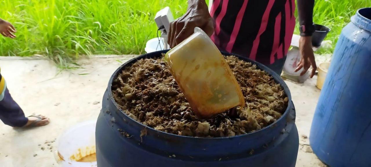 ขณะที่ ผศ.ดร.ซารีนา สือแม ร่วมกับ คณะเกษตรศาสตร์ มหาวิทยาลัยนราธิวาสราชนครินทร์ ได้เล็งเห็นปัญหา เปลือกทุเรียนในวิสาหกิจชุมชน พบว่าการทำทุเรียนกวนของที่นี่ ส่งผลให้มีขยะเปลือกทุเรียนถูกทิ้งโดยไม่ได้นำมาใช้ประโยชน์อะไรประมาณ 30 ตันต่อวัน จนทำให้กลายเป็นกองขยะกองโต ยิ่งทุเรียนบางลูกที่เสียแล้วจะมีหนอนเจาะ ชาวบ้านก็จะทิ้งรวมกับเปลือกทุเรียน ยิ่งทำให้เป็นที่หมักหมมเยอะ