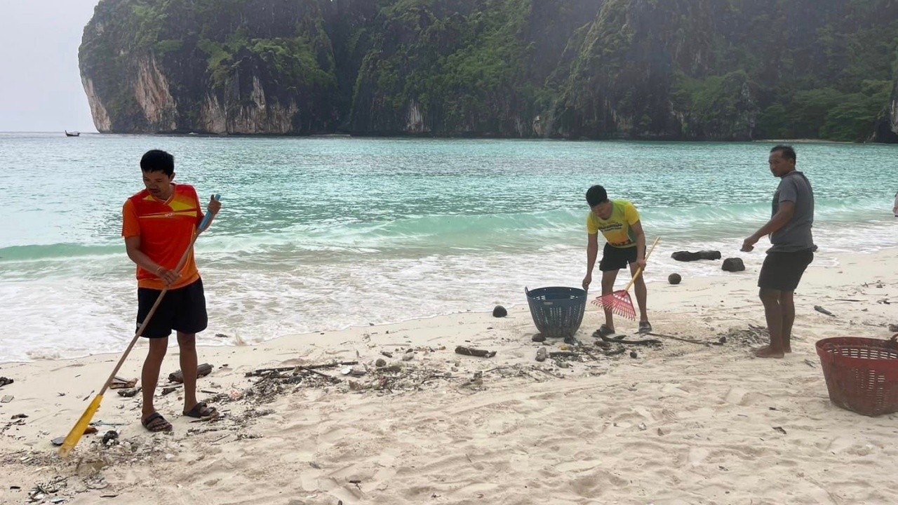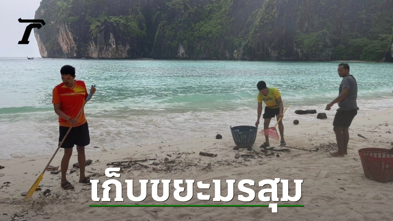 เจ้าหน้าที่อุทยานฯ เร่งเก็บ "ขยะมรสุม" ลอยอยู่เหนือทะเล บริเวณเกาะพีพีเล เผย เป็นขยะจากชายฝั่ง ที่พัดมาตามจุดต่างๆ ปีนี้เจอในช่วง พ.ค. - ก.ค.