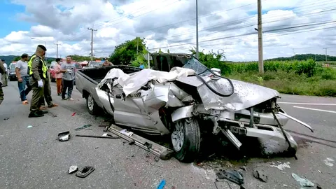 กระบะกลับจากงานวันเกิด พุ่งเสยท้ายสิบล้อ รถพังยับ ดับ 2 ศพ เจ็บ 3 ราย