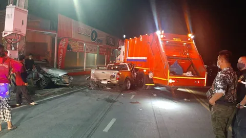 ตูมสนั่น รถขยะจอดข้างทาง กระบะพุ่งเสย-เก๋งตาม เจ็บ 3 สุดยื้อตาย 1