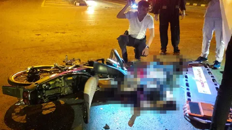 โจ๋ซิ่งจยย.ฝ่าไฟแดงกลางเมืองมุกดาหาร ถูกกระบะชนดับ 1 เจ็บ 1
