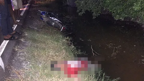 หนุ่มใหญ่ดวงจู๋! ขี่จักรยานยนต์ล้ม ตัวกระเด็นตกน้ำดับ!