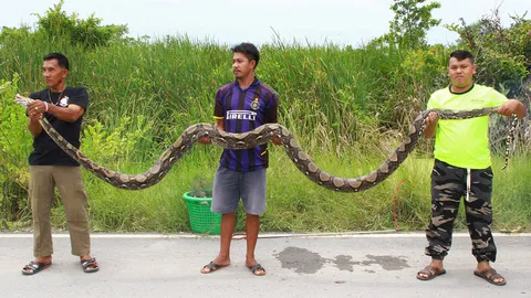 ผงะ งูยักษ์ 8เมตร ติดอวนบ่อกุ้ง!ใหญ่จริงหัวข้ามถนน หางยังอยู่อีกฝั่ง