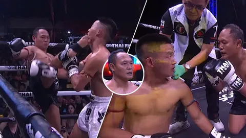 "นักมวยไทย วัย 42 ปี" โดนเบ่งกล้ามใส่ ก่อนจัดหนัก ต่อยหน้า-เตะก้านคอ ชนะน็อก ยก 2 (คลิป)