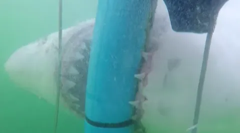 ห่างแค่คืบเดียว! นาทีระทึก ฉลามขาวสุดโหด กัดกรงไม่ยั้ง (ชมคลิป)