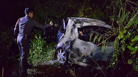 เก๋งแหกโค้งกระแทกเสาไฟฟ้า ไฟท่วมย่างสดหนุ่มดับคารถ