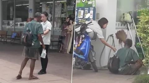 สังคมต้องการคนแบบนี้! สาวเซเว่นน้ำใจงามมอบอาหารให้ชายคุ้ยขยะ (คลิป)