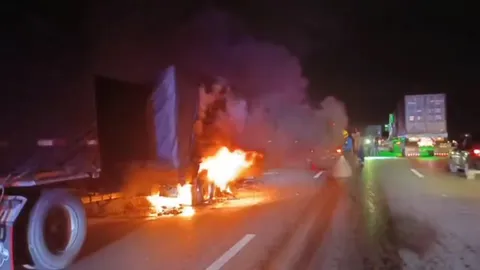 ระทึก รถพ่วงขนน้ำยาลอกท่อ ยางระเบิดไฟลุก กลางถนนสายเอเชีย