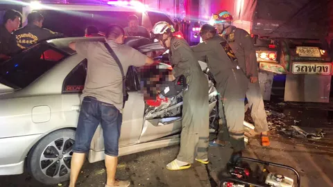 เก๋งชนท้ายพ่วงจอดเสียที่บางบัวทอง กู้ภัยต้องงัดซากช่วยพา 3 ชีวิตส่ง รพ.