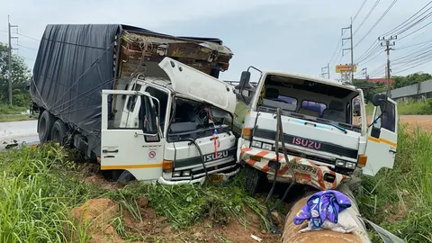 รถบรรทุกเสียหลักชนกันที่สงขลา เจ็บ 3 รายติดคารถ 2 กู้ภัยงัดร่างนำส่ง รพ.