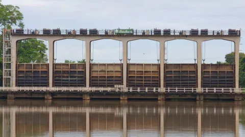 ท้ายเขื่อนเจ้าพระยา น้ำต่ำกว่าตลิ่งไม่ถึงเมตร ซึมตามกระสอบทรายไหลเข้าบ้านเรือน