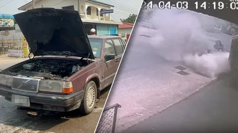 ครูสาวลพบุรีขับเก๋งมามีกลิ่นไหม้ ควันออกก่อนไฟไหม้ โชคดีหนีทันแต่รถเสียหาย