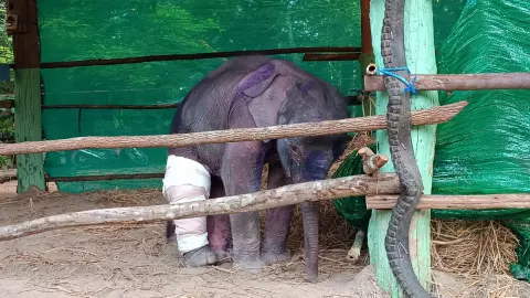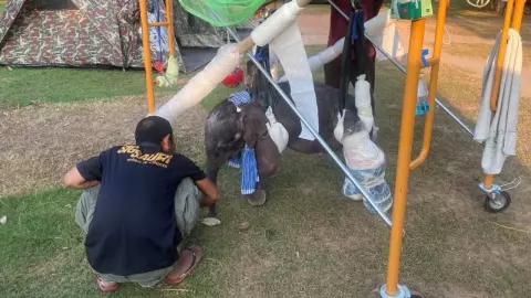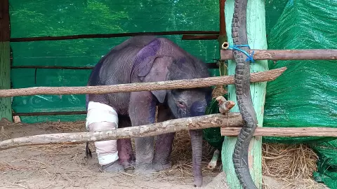 ทีมสัตวแพทย์ฯ เตรียมใส่เฝือกรักษา "น้องเดือน" ลูกช้างป่าพลัดหลง