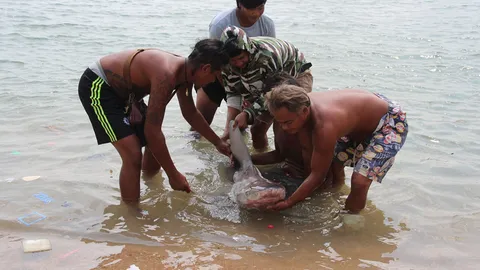 ชาวบ้านแห่ช่วย 'ฉลามขาว' บาดเจ็บ พัดเกยตื้นก่อนสิ้นใจตาย