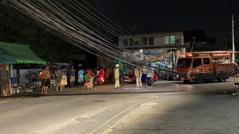 เสาไฟแรงสูง ล้มพาดถนน แม่ค้าถั่วต้มเข็นรถหนีตายหวิด คาดแบกน้ำหนักมาก