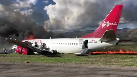 เปรูเวียน แอร์ไลน์ส ลงจอดฉุกเฉิน ไถลออกรันเวย์ ไฟลุก! อพยพ 141 ชีวิต (คลิป)