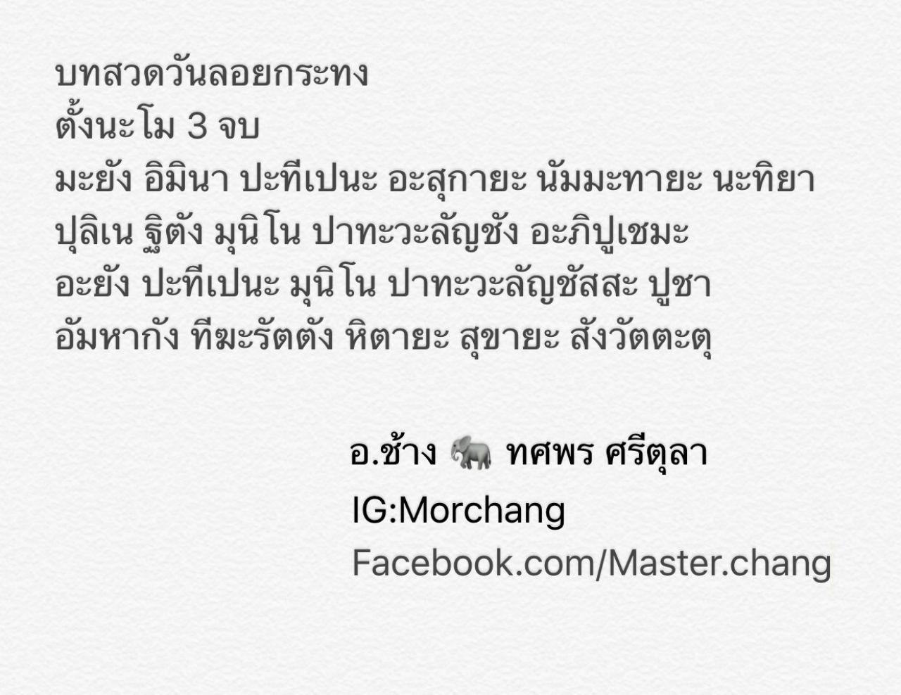 หมอช้าง ทศพร ศรีตุลา หมอดูชื่อดังเจ้าของฉายาจอมสถิติ จึงออกมาแนะนำผ่านไทยรัฐออนไลน์ถึงเคล็ดลับในการเสริมสิริมงคลวันลอยกระทงว่า หนึ่งในวัตถุประสงค์ของการลอยกระทงคือการสักการะรอยพระพุทธบาทที่ริมฝั่งแม่น้ำนัมมทา ใครไปลอยกระทงคืนนี้อย่าลืมสวดบทสวดบูชารอยพระพุทธบาทนี้