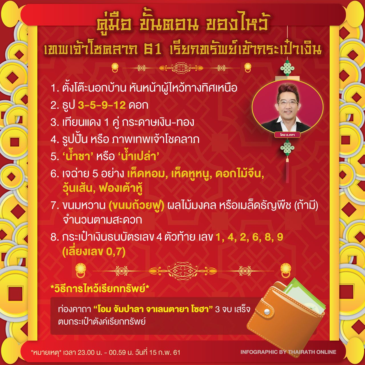 นอกจากเรื่องปีชงแล้ว เรื่องการไหว้เทพเจ้าไฉ่ซิงเอี้ย เครื่องเซ่นไหว้ อุปกรณ์ ทิศ คาถา และวิธีการ ถามไถ่กันตอบกันมากมายว่าเป็นวันไหนกันแน่ ไทยรัฐออนไลน์มีโอกาสได้สัมภาษณ์ ซินแสชื่อดังระดับประเทศ อย่าง อ.คฑา ชินบัญชร ผู้เชี่ยวชาญในการทำพิธีมาเปิดเผยเคล็ดลับอย่างละเอียด...