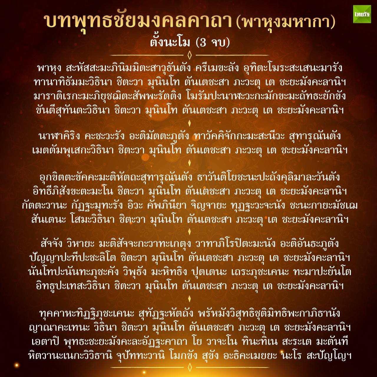 อิทธูปะเทสะวิธินา ชิตะวา มุนินโท ตันเตชะสา ภะวะตุ เต ชะยะมังคะลานิฯ