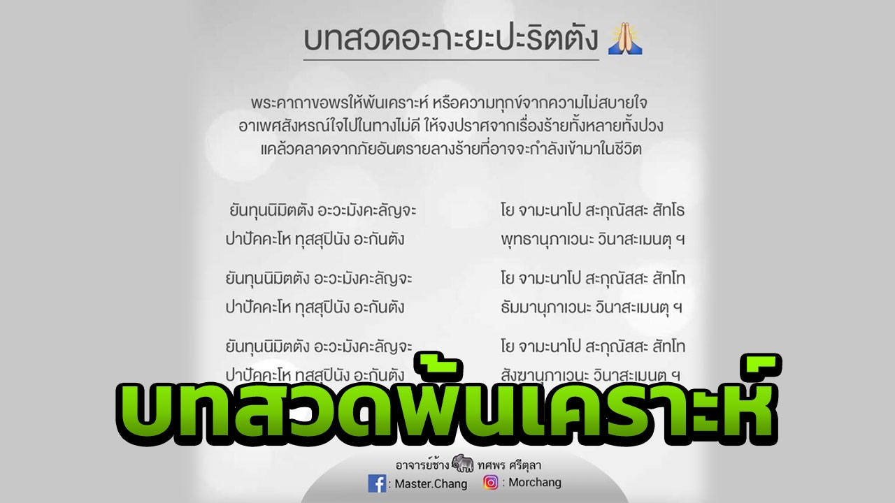 ช่วงนี้มีแต่ข่าวที่ทำให้คนไทยทั้งประเทศเสียขวัญ วิตกกังวล และส่งแรงใจไปช่วย ไม่ว่าจะเป็นกรณีทีมหมูป่าติดถ้ำ หรือจะเป็นเรือล่มที่ภูเก็ต เซ็กชั่น horoscope จึงขอเปิดบทสวดอะภิยะปะริตตัง ซึ่งหมอดูชื่อดัง หมอช้าง ทศพร ศรีตุลา ได้โพสต์ไว้ในแฟนเพจ มาให้ได้สวดไปพร้อมๆ กัน...