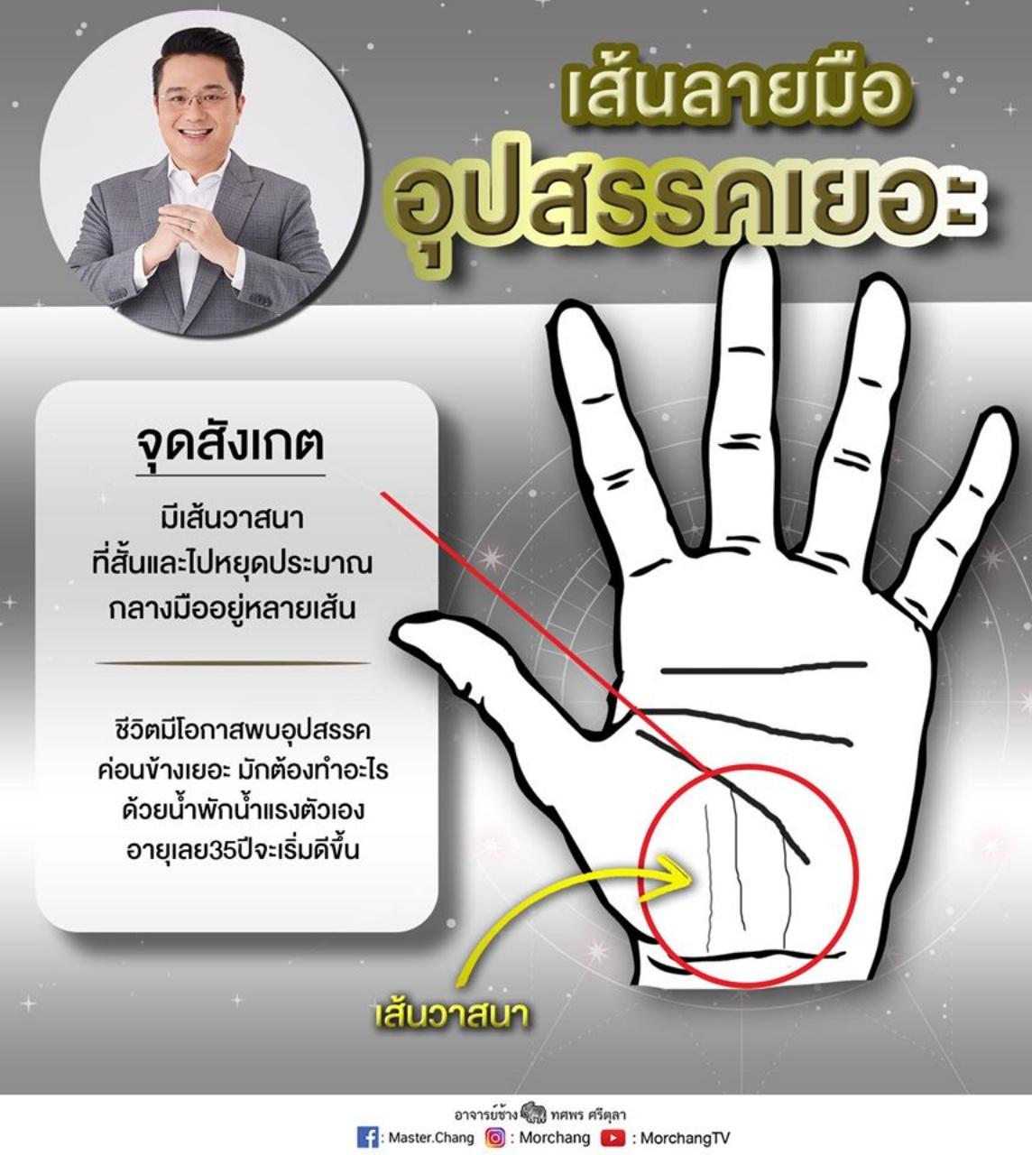 เส้นลายมือแบบนี้ หมอช้าง อาจารย์ ทศพร ศรีตุลา บอกกับ ไทยรัฐออนไลน์ ว่าเจ้าของฝ่ามือที่มีเส้นลายมือแบบนี้ มีเกณฑ์ มีปัญหา มีอุปสรรค ต้องทำอะไรในชีวิตด้วยตัวเอง