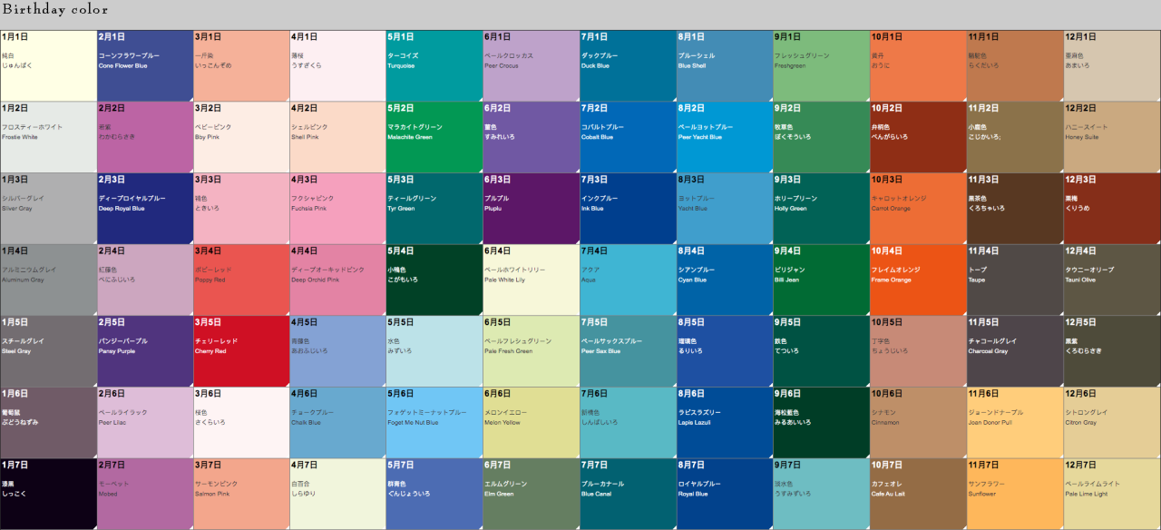 เมื่อพูดถึงเฉดสีประจำวันเกิดแบบฉบับคนญี่ปุ่น ในรูปแบบสายมู มีมากกว่า 7 สี พร้อมให้นำ Code สี ไปสร้างเป็นกราฟิก Wall Paper หรือใช้ออกแบบงานอาร์ตต่างๆ ได้ โดยเข้าไปที่ http://birthday-color.cafein.jp คลิกเลือกวันเกิดของเรา ทั้ง 365 วันก็จะมีชื่อสีประจำวันกำกับอยู่