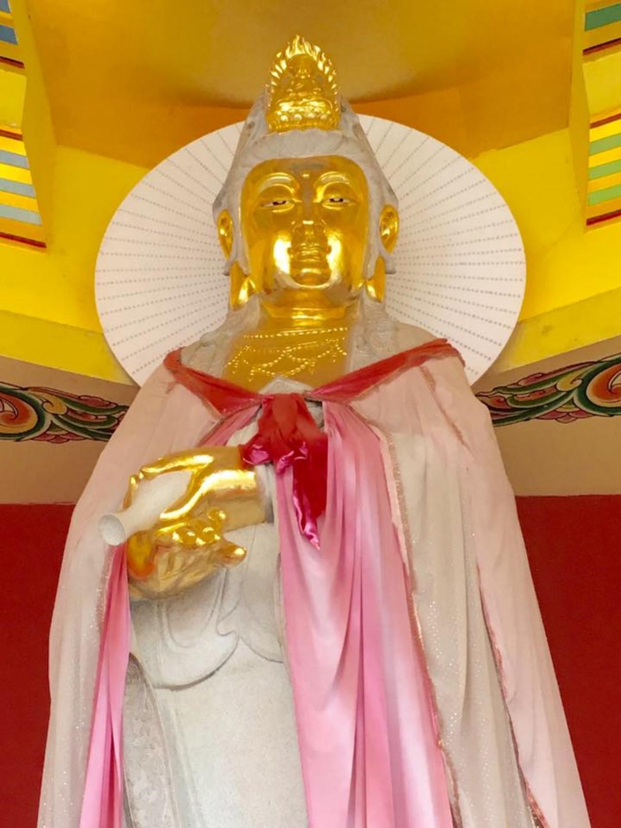 เราเลยตั้งสัจจะตั้งแต่เด็กว่าเราจะไม่กินเนื้อวัว ตั้งแต่วันนั้นเลย เพราะเรารอดตายเพราะเจ้าแม่กวนอิมมา ก็จึงเป็นที่มาของรูปเจ้าแม่กวนอิมองค์ใหญ่ที่อยู่ในวัดนี้แล้วก็มาจากประเทศจีน
