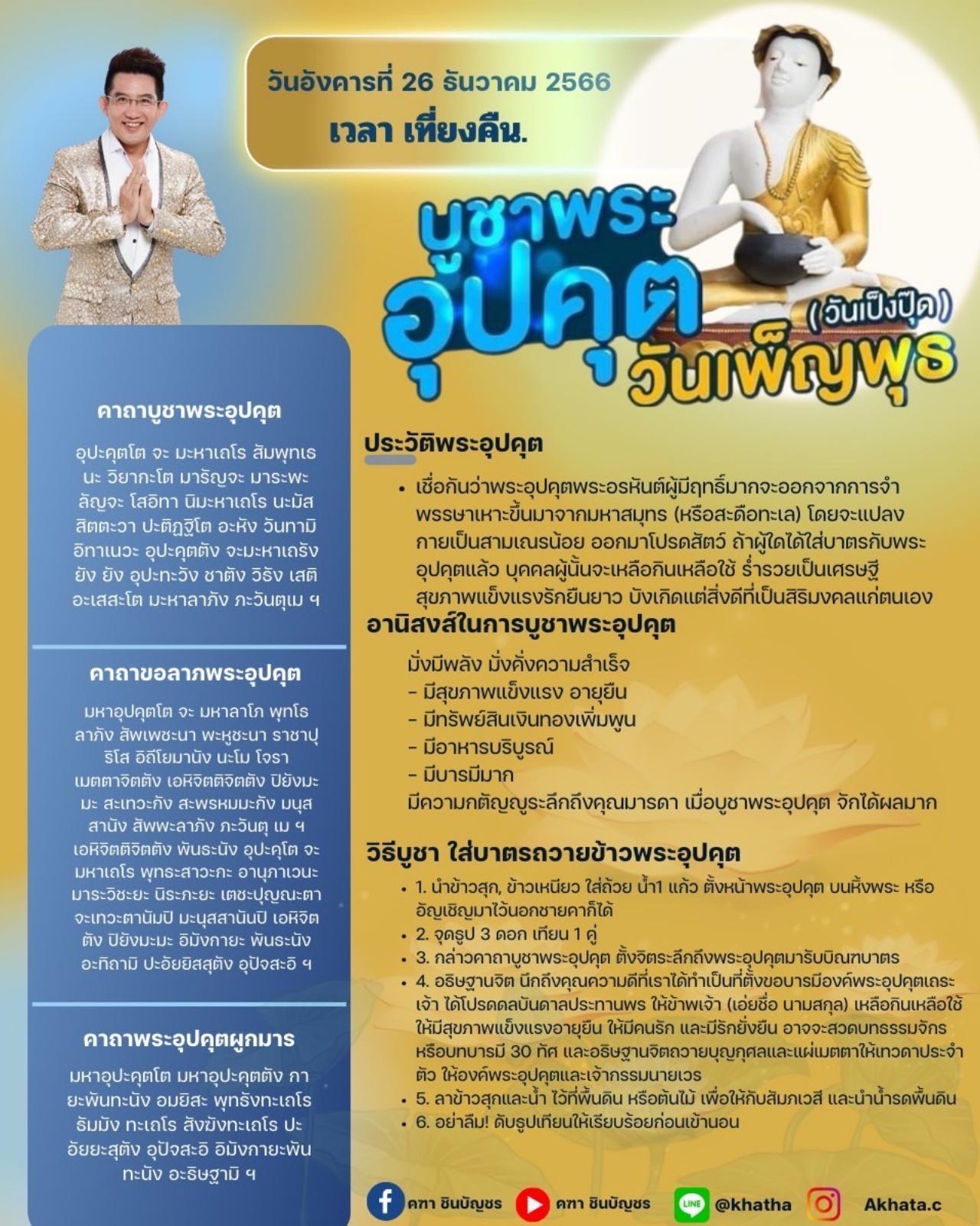 อ.คฑา ชินบัญชร เปิดวิธีไหว้บูชาพระอุปคุต เนื่องในวันเพ็ญพุธ หรือ เรียกว่าอีกอย่างว่าเป็งปุ๊ด 26 ธันวาคม 2566 เวลาเที่ยงคืน คืนนี้ เพื่อขอโชคลาภ ความมั่งคั่ง ความเป็นสิริมงคล มีทรัพย์สินเพิ่มพูน ขอความเป็นสิริมงคล ความรักดี มีเหลือกินเหลือใช้ ความเชื่อในวันนี้ พระอุปคุตท่านจะลงมาโปรดให้โชคชัย กับเหล่าพุทธศาสนิกชนผู้มีความศรัทธาในพระอุปคุต นั่นเอง