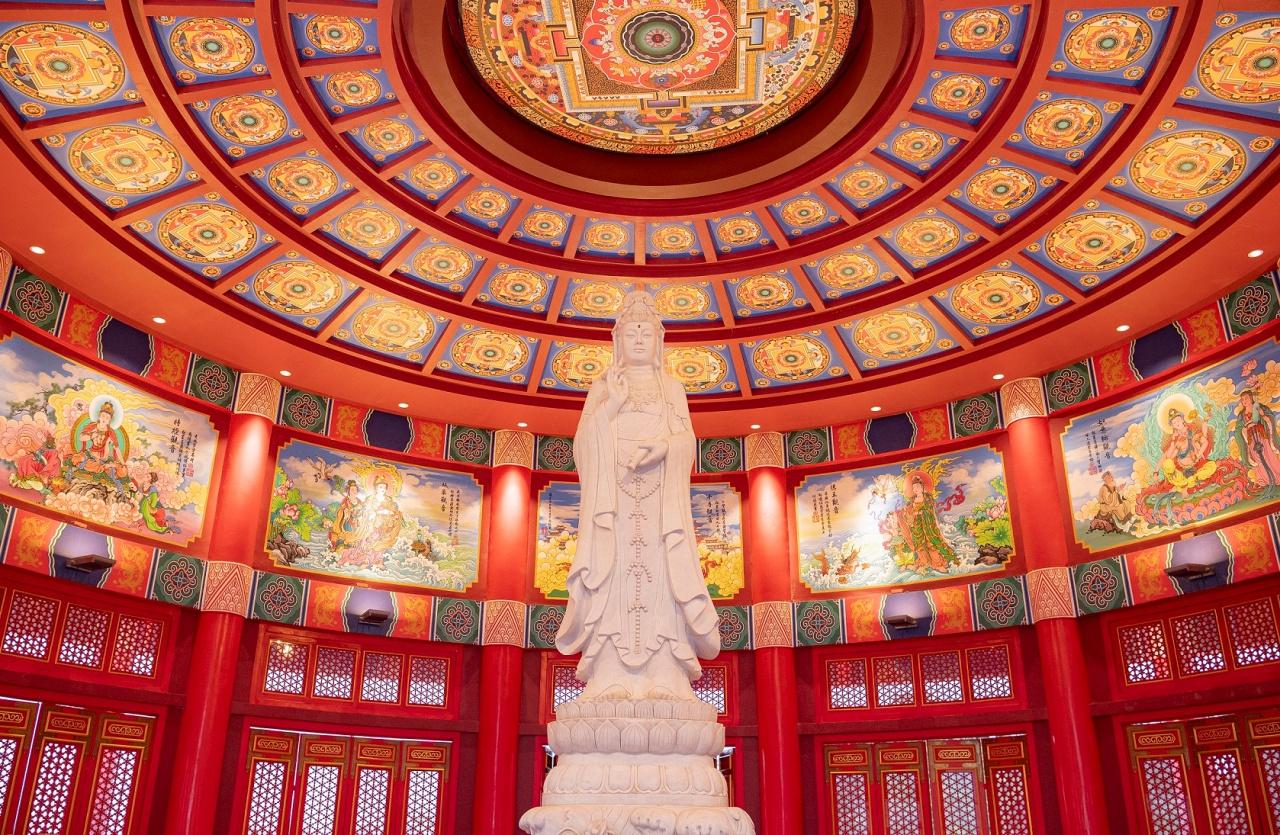 โดยแบ่งเป็นวงใน 12 ต้น มีความหมายถึงเดือนทั้ง 12 เดือน และวงนอก 12 ต้น หมายถึงเวลา 12 ชั่วยาม ฝ้าเพดานเป็นรูปมันดาลา หรือ "มณฑล" ในภาษาไทย ซึ่งมีความหมายในพุทธศาสนานิกายวัชรยาน (ทิเบต) ถึงมณฑลศักดิ์สิทธิ์แห่งการตรัสรู้ ภายในวิหารโดยรอบยังมีภาพวาดพระโพธิสัตว์กวนอิมปางต่างๆ 11 ปาง ด้านบนติดตั้งเสาล่อฟ้า เป็นสัญลักษณ์แทนการดึงพลังงานจากฟ้ามายังผู้มีจิตศรัทธาที่มาสักการะองค์พระโพธิสัตว์กวนอิม
