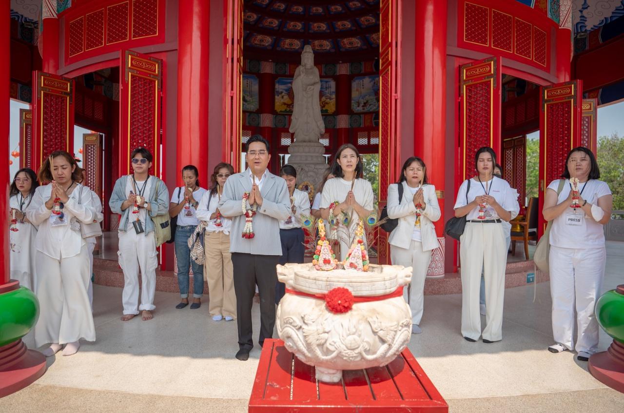 จากนั้นเราค่อยไปสักการะพระโพธิสัตว์กวนอิมกันต่อ โดยเมื่อเดินทางถึงวิหารดังกล่าว ถึงแม้แดดจะร้อน แต่ก็ยังมีลมอ่อนๆ เบาๆ และเราทึ่งไปกับความสวยของวิหารสถาน แบบลืมความร้อนกันไปเลยทีเดียว และเมื่อไปถึงได้มี คุณธนินธร โชควัฒนา ผู้อำนวยการฝ่ายสื่อสารองค์กรและธรรมาภิบาล บริษัท สหพัฒนาอินเตอร์โฮลดิ้ง จำกัด (มหาชน) ได้เล่าถึงวิหารสถานแห่งนี้ให้เราฟัง และเริ่มทำพิธีสักการะพร้อมกันทันที