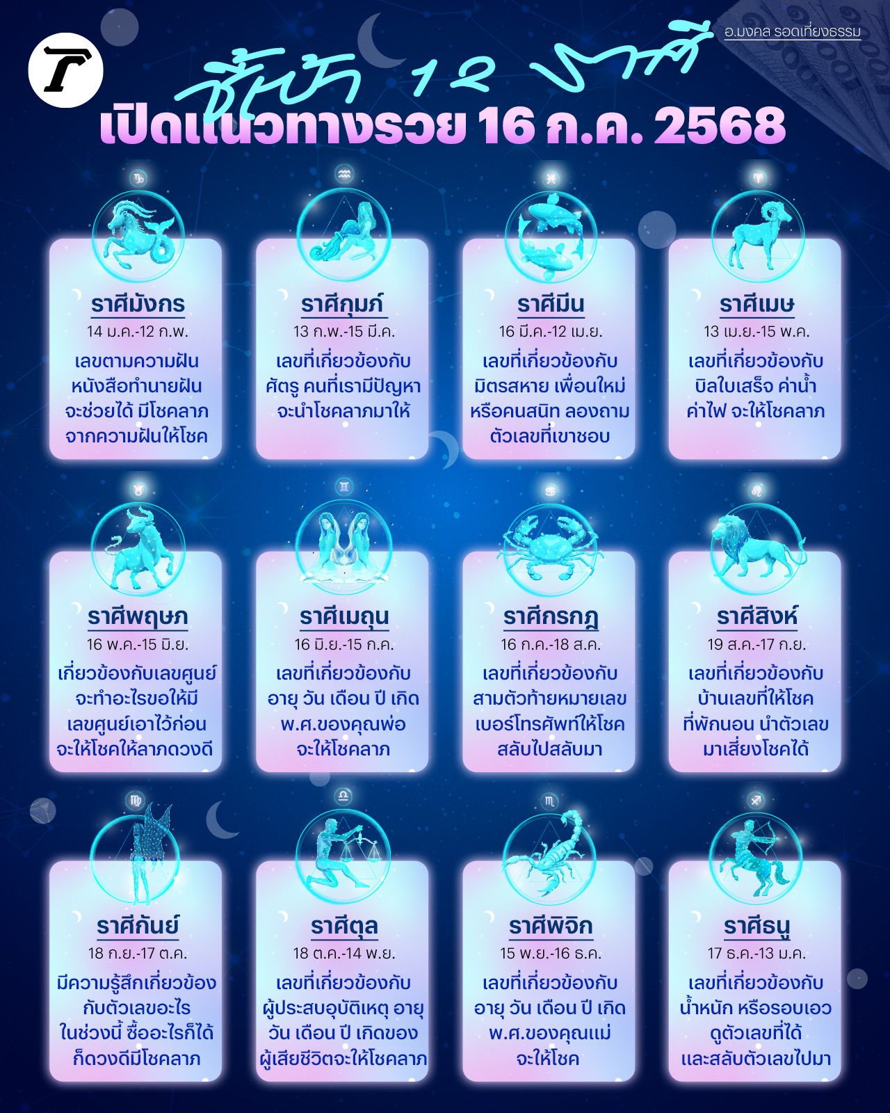 ราศีที่มีโอกาสถูกรางวัลที่หนึ่ง ในวันพุธที่ 16 กรกฎาคม 2568 ได้แก่ราศีกันย์ พฤษภ เมถุน พิจิก สิงห์ ธนู มีน มังกร